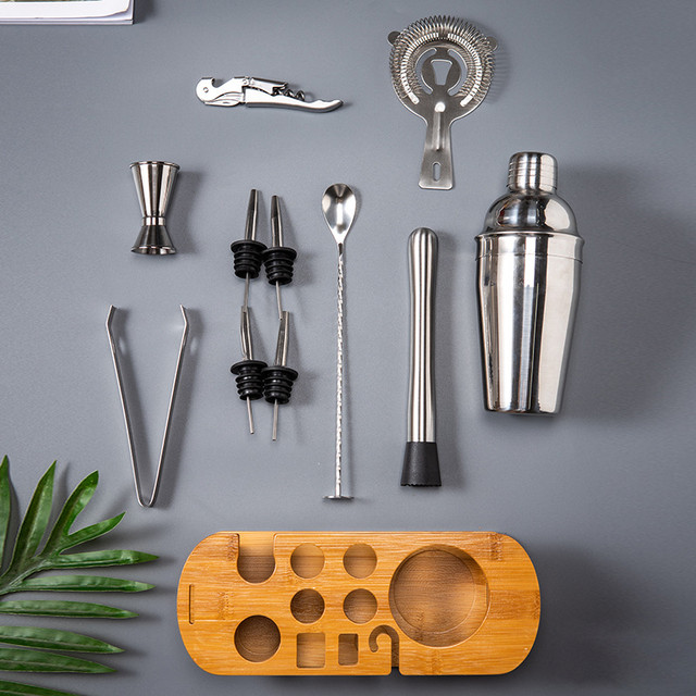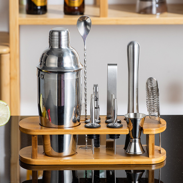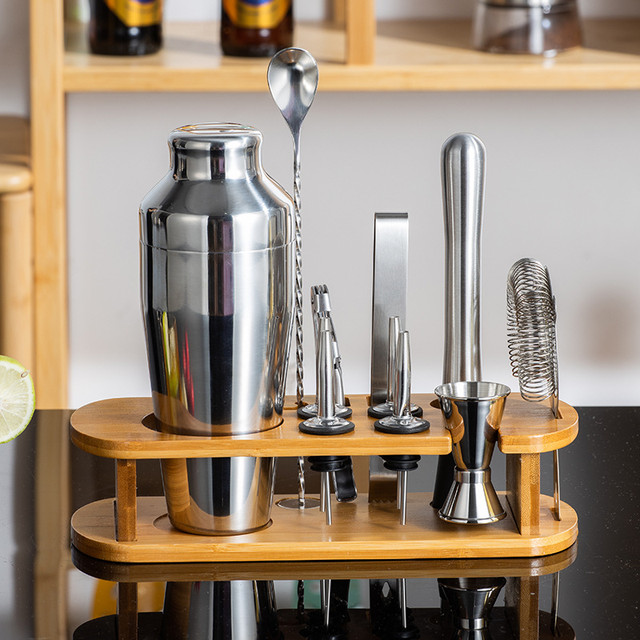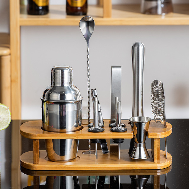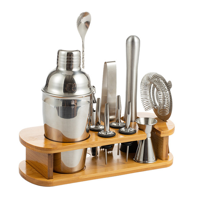Набор барных инструментов включает 12 предметов из нержавеюжей стали на деревяной подставке. Приборы надежно защищены от мелких царапин, коррозии, не тускнеют и не изменяют вкус продуктов.
