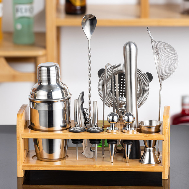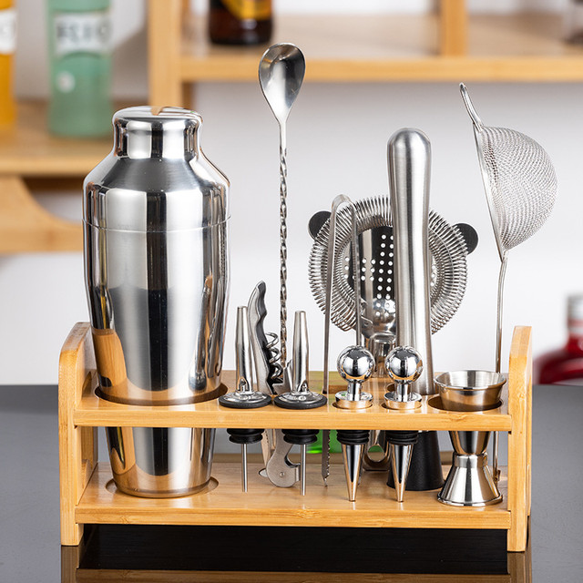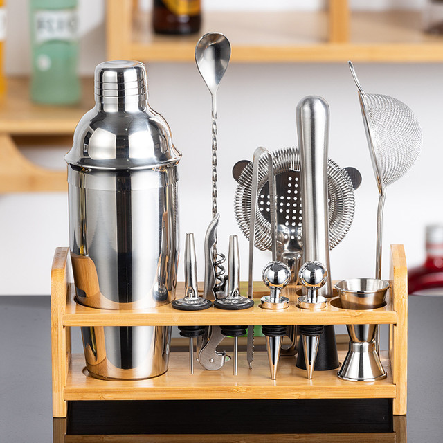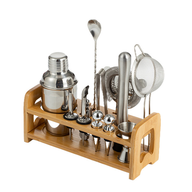 Набор барных инструментов включает 13 предметов из нержавеюжей стали на деревяной подставке. Приборы надежно защищены от мелких царапин, коррозии, не тускнеют и не изменяют вкус продуктов.
