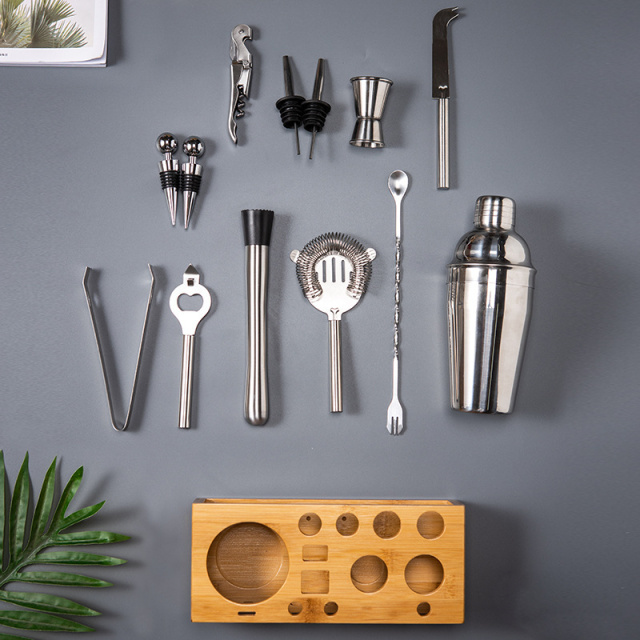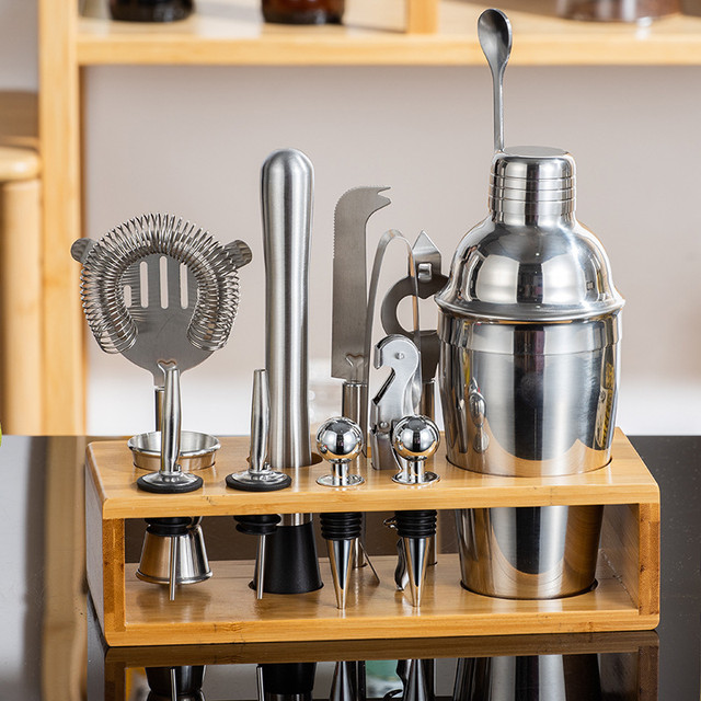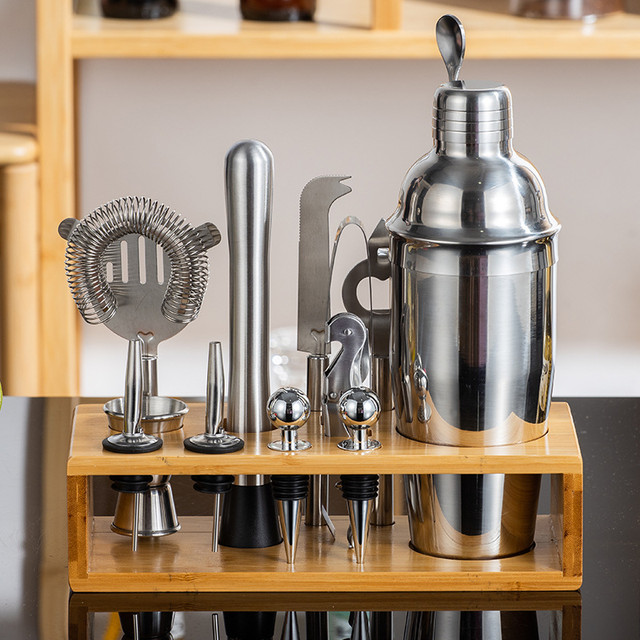Набор барных инструментов включает 15 предметов из нержавеюжей стали на деревяной подставке. Приборы надежно защищены от мелких царапин, коррозии, не тускнеют и не изменяют вкус продуктов.