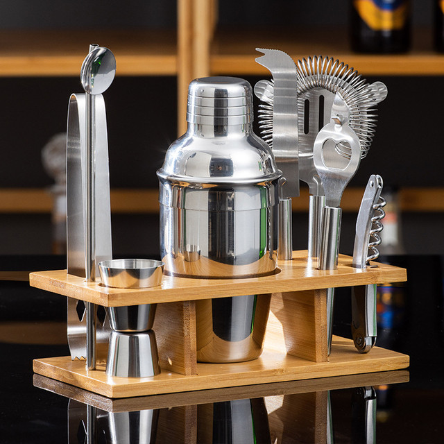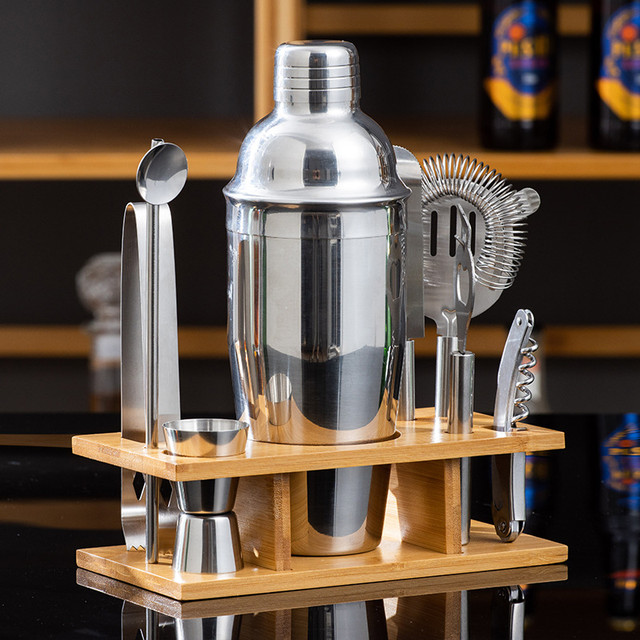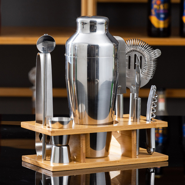 Набор барных инструментов включает 9 предметов из нержавеюжей стали на деревяной подставке. Приборы надежно защищены от мелких царапин, коррозии, не тускнеют и не изменяют вкус продуктов.