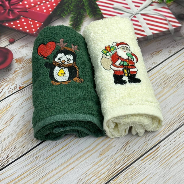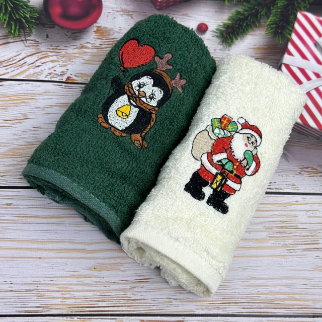 Набор махровых кухонных полотенец Турция Новый год Санта с подарками Пингвин 13937 30х50 см 2 шт