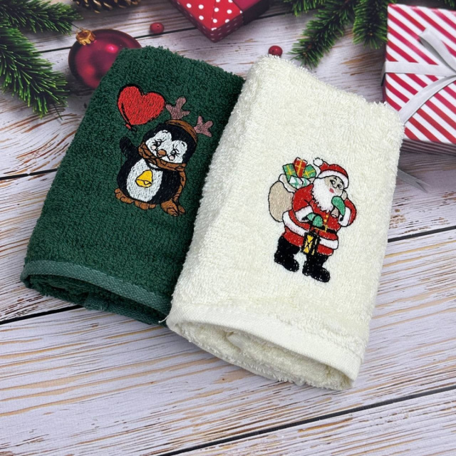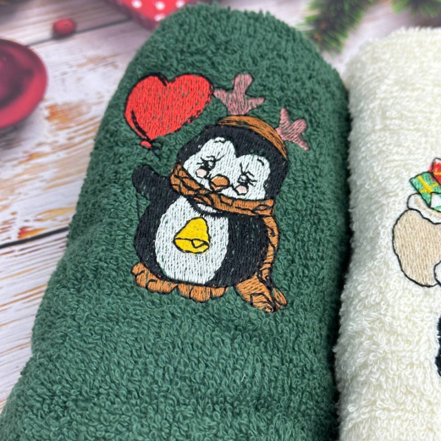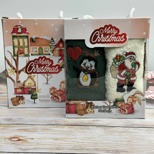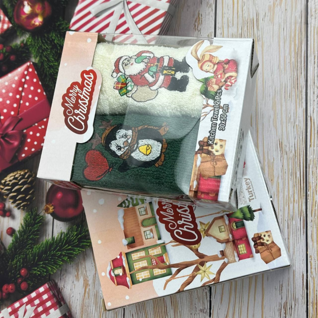 UA MarketОдессаBestoreТовары и услугиДомашний текстильТекстиль для кухниКухонные полотенцаНабор махровых кухонных полотенец Турция Новый год Санта с подарками Пингвин 13937 30х50 см 2 шт
