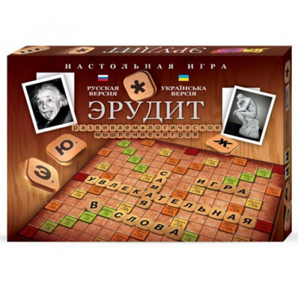 Настольная игра Эрудит. Правила игры: игровое поле состоит из 15х15 клеток, то есть 225 квадратов, на которые участники игры выкладывают буквы, составляя тем самым слова. В начале игры каждый игрок получает 7 случайных букв. К середине игрового поля выкладывается первое слово, затем следующий игрок может добавить слово "на пересечение" из своих букв. Слова излагаются линию по горизонтали, или по вертикали. Гарантирует веселое времяпровождение.