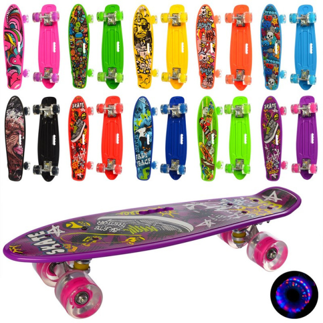 Пени борд MS-0749-6. Колеса выполнены из полиуретана. Отличное транспортное средство для активных и спортивных детей, любящих отдых на свежем воздухе и активные виды развлечения.