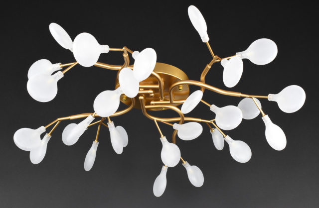Потолочная люстра с плафонами-лепестками на 28 лампочек. Корпус металлический. Патрон G4, лампочки в комплекте мощностью 2 Вт, цветовой режим 4000К, плафоны стеклянные, размер плафона 9х7 см, крепление к потолку на крестовину, основа диаметром 20 см.