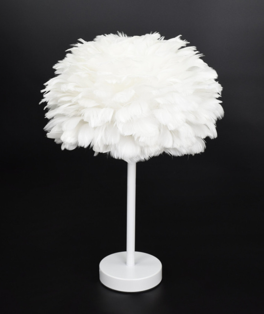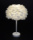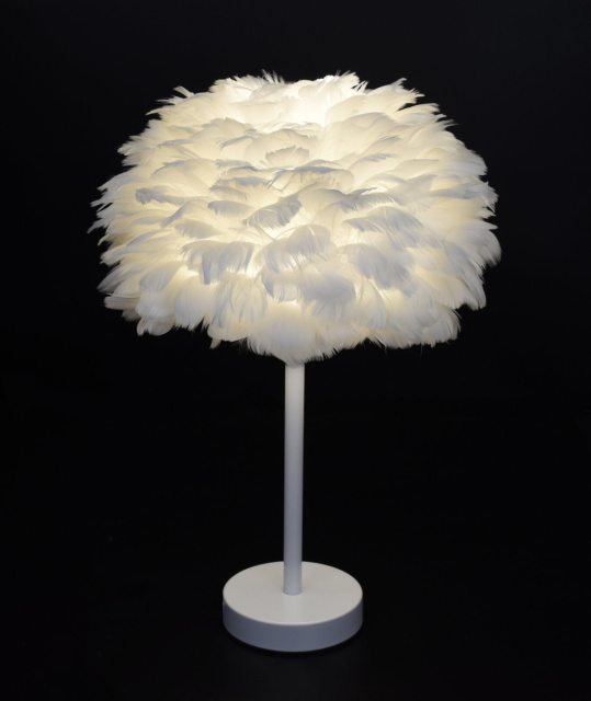 Настольная лампа на одну лампочку.Корпус металлический белого цвета, абажур из натуральных перьев. Высота 50 см, диаметр 30 см, патрон E27, основание диаметром 12 см, провод с вилкой и выключателем длиной 140 см.