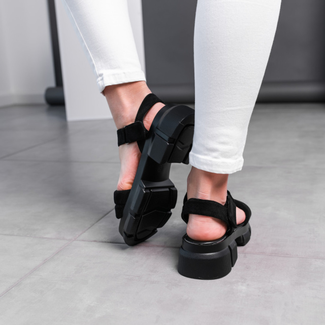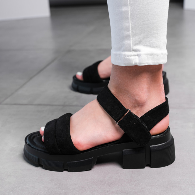 Сандалии из искусственной замши черного цвета модное решение, которого требуют ваши образы. Модель без лишних элементов, дополнена застежкой ремешком. Сандалии женские позволят вам всегда чувствовать себя комфортно и выглядеть стильно.