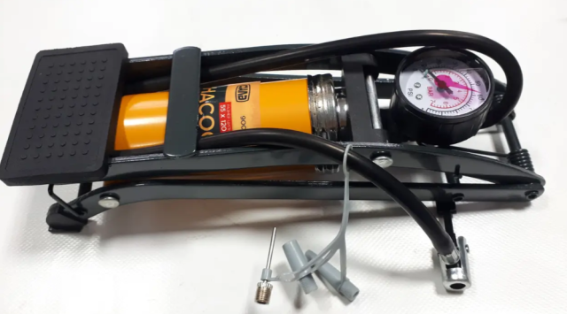 Насос ножной Сила однопоршневой усиленный: размер цилиндра - 55х120 мм; рабочий объем цилиндра - 285 см?; материал цилиндра - металл; максимальное давление - 7 атмосфер; длина шланга - 55 см; манометр - аналоговый.