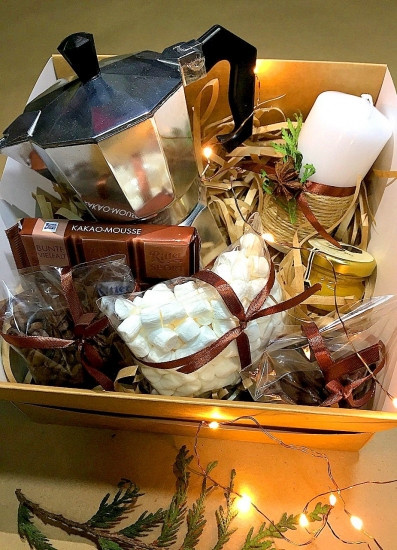 Кофейный Романтикпредназначен не только для любви; но и для теплых душевных разговоров. Идеально подойдет; как Мужчине так и Женщине. Особенность его это много сладостей и маленькая Гейзерная Кофеварка. А если Вы спросите; что это такое? - коферка; в которой горячая вода; вытесняемая давлением пара; поднимается из нижнего резервуара в верхний через отделение с молотым кофе.