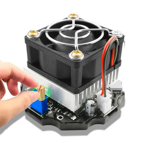 Нагрузка оснащена бесщёточным вентилятором с автоматической регулировкой вращения в зависимости от температуры. Для выставления тока нагрузки предусмотрен переменный многооборотный резистор. Также имеется переключатель для включения и выключения нагрузки и светодиод для сигнализации подачи напряжения.