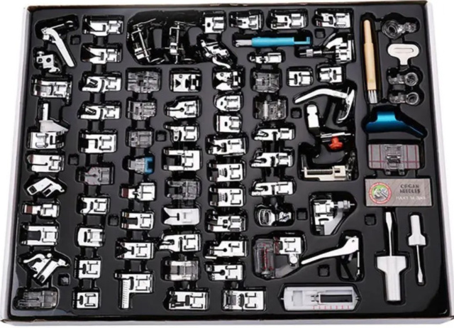 У набір включено 82 лапки різного призначення: лапка для оздоблювальної рядки з лінійкою; універсальна лапка; відкрита металева лапка для аплікації; лапка для вшивання блискавки та шнурів.