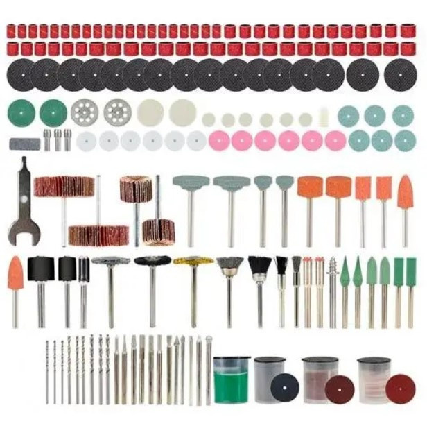 У комплектацію входять: шліфувальна насадка з робочим діаметром 13 мм; шліфувальна стрічка 13 мм (18 шт.); шліфувальна насадка з робочим діаметром 9.5 мм; шліфувальна стрічка 9.5 мм (16 шт.); шліфувальна насадка з робочим діаметром 6.4 мм; шліфувальна стрічка 6.4 мм (18 шт.); оправка/тримач дисків (3 шт.); полірувальна насадка (16 шт.); свердло (9 шт.); насадка з повсті 13 мм (6 шт.); насадка з повсті 25 мм (2 шт.); насадка з повсті 10.5 мм; фреза для гравера (12 шт.); абразивний шт. круг 19.5 мм (18 шт.); полірувальний круг 22.5 мм (2 шт.); алмазний відрізний диск 22 мм (2 шт.); круглі пелюстковий віяловий 31.5 х 10 х 3.17 мм (2 шт.); круглий пелюстковий віяловий 20 х 20.6 х 3.17 мм; круглий пелюстковий віялий 20 х 25 х 3.17 мм; шліфувальний диск 20 мм (30 шт.); відрізне коло 24 мм (72 шт.); відрізне коло 32 мм (40 шт.); металева щітка (4 шт.); нейлонова щітка (3 шт.); шаблон-ключ; брусок для заточування; паста полірувальна.