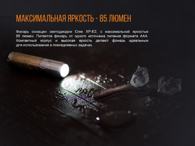Маючи невеликі габарити, ліхтар працює з однією лише лужною батарейкою ААА. Втім, в якості елемента живлення можна використовувати і Ni-MH акумулятори, перезаряджаючи їх за допомогою звичайного зарядного пристрою. Час роботи одного акумулятора в ліхтарі F15 до повної розрядки становить до 14,5 годин при його ємності 750 мАг. Батарейка пропрацює близько 15 годин.