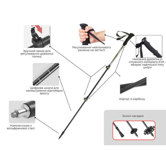 Завдяки трубкам з карбону вироби характеризуються несприйнятливістю до деформування та зберігають початкову форму, слугуючи додатковою точкою опори та допомагаючи користувачу у подоланні складних ландшафтів. Палиці також знижують навантаження з колін та спини, рівномірно розподіляючи його по всьому тілу, що особливо актуально у разі носіння об'ємного туристичного рюкзака.