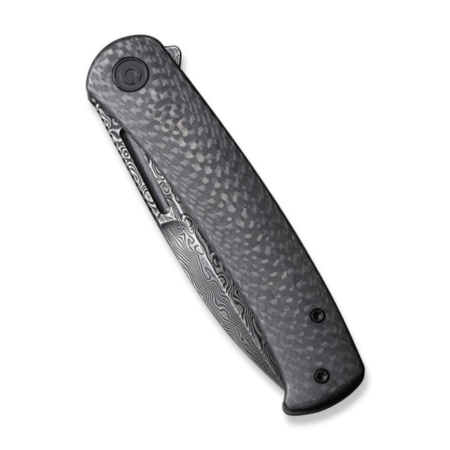 Плашка з карбону з одного боку мінімізує ковзання ножа у долоні. З іншого боку оголена сталева конструкція руківʼя, доповнена кліпсою Tip-Up. Кліпса закріплена двома гвинтами та не передбачає зміни положення.