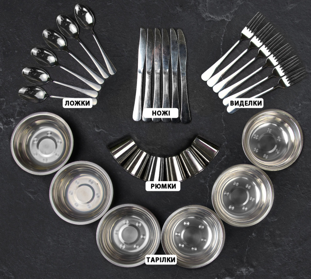 Всі предмети виготовлені з нержавіючої сталі, що гарантує їхню надійність і довговічність.