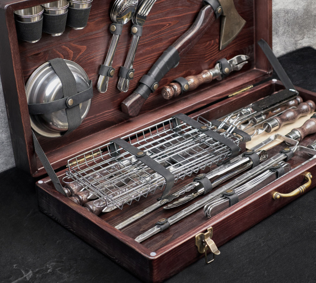 У комплекті є шампури з художнім литтям з бронзи, а також ексклюзивна сокира з травленням, що робить цей набір чудовим подарунком для будь-якого чоловіка.