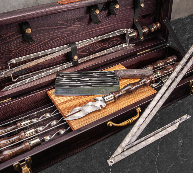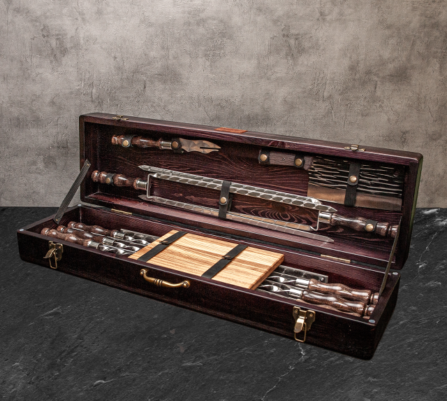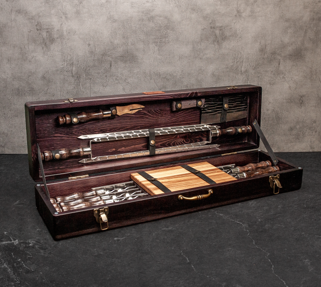 Елегантний дизайн:Дерев’яний кейс надає набору естетичного вигляду, що робить його не лише практичним, а й стильним доповненням до вашого арсеналу для барбекю.