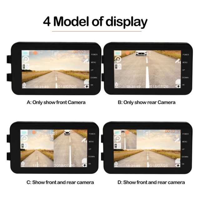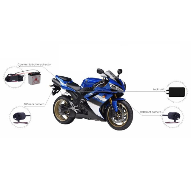 Комплект мото реєстратора складається з блоку управління з кольоровим 4 "екраном і двох 2 Мп AHD камер з кутом огляду 140 градусів для установки спереду і ззаду. Камери і корпус блоку управління захищені за стандартом IP65 і мають гарну вологозахистом від будь-якого дощу. Зйомка починається автоматично при включенні харчування, а також по датчику руху або G-sensor.