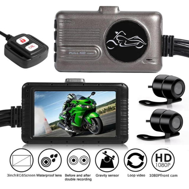 У комплект входять передня і задні водонепроникні камери з кабелями удлинителями, металевий реєстратор з 3 "кольоровим екраном, блок живлення, виносний пульт. Корпус самого блоку реєстратора металевий, не боїться ударів, має кнопки управління і слот для карти пам'яті. Підключення живлення передбачено від бортової електромережі мотоцикла, але так само реєстратор має свій невеликий акумулятор для екстреного запису файлу під час ДТП.