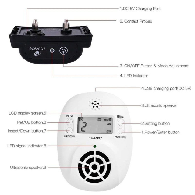 Представляємо вашій увазі PET YQJ-907, бездротовий бар'єр для домашніх тварин і відлякувач комах в одному пристрої. З його допомогою ви можете виключити відвідування домашніми вихованцями і захистити від комах потрібні зони в будинку і у дворі, наприклад місця зберігання їжі, сміттєві баки, ліжка, місця пікніка і т.д.