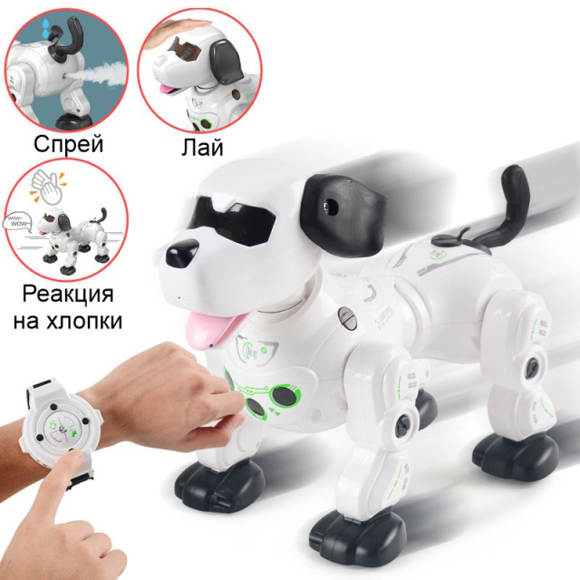 Ваша дитина при грі з собакою роботом керує нею дистанційним пультом, який має вигляд наручного годинника. Він може натискати на ньому кнопки, які задають напрямок руху собаки уперед-назад і вліво-вправо, включити розпилювач або використовувати режим "йди за мною", коли робот переміщується за лазерним променем, що виходить з пульта. Якщо доторкнутися до голови або підборіддя собаки, то іграшка відреагує радісними звуками і вилянням хвоста, а дотик до зони хвоста викликає спрацьовування розпилювача в хвостовій частині.