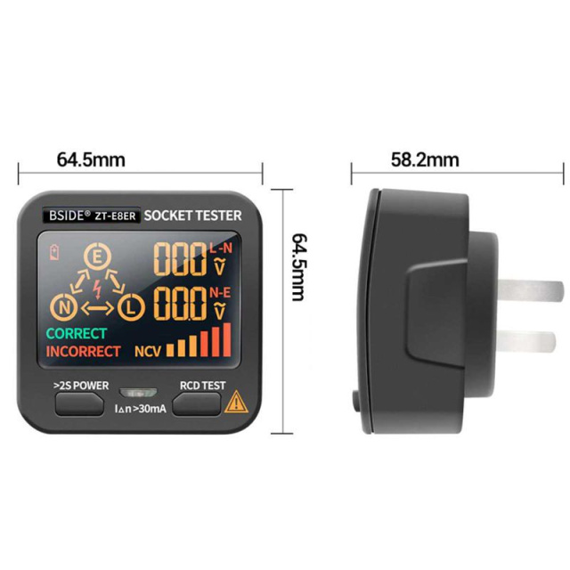 Для тестування BSIDE ZT-E8ER вставляється в гніздо розетки, результати виводяться на кольоровий дисплей. Правильність підключення зображується в графічному вигляді, також виводяться цифрові показники про те, яка напруга в розетці між фазою і між нулем і землею, повідомлення про правильному чи неправильному підключенні фази нуля і заземлення (чи не переплутали контакти, чи немає обриву). Варто зазначити, що відображення результатів тесту настільки просте, як професіоналу, так і любителю. У цьому тестері розеток є додаткова функція безконтактного індикатора напруги, яка допоможе вам знайти дроти під напругою від 20 Вольт і вище також наявність обриву в них, а так само функція RCD штучного створення витоку струму для тестування справності ПЗВ.