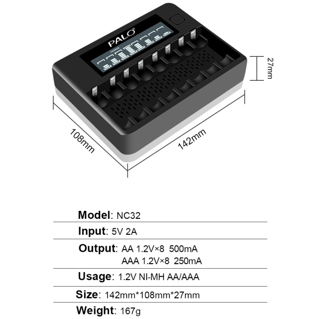 Інтелектуальний зарядний пристрій Palo NC32 призначений для одночасної зарядки до 8 штук нікель-металогідридних (NiMH) і нікель-кадмієвих (NiCd) акумуляторних батарей 1.2 вольта типорозміру АА або ААА. Пристрій має функцію розряджання акумуляторів. Має LCD екран, що відображає процес заряду кожного слота. Декілька ступенів захисту від перезаряду, короткого замикання, перегріву.