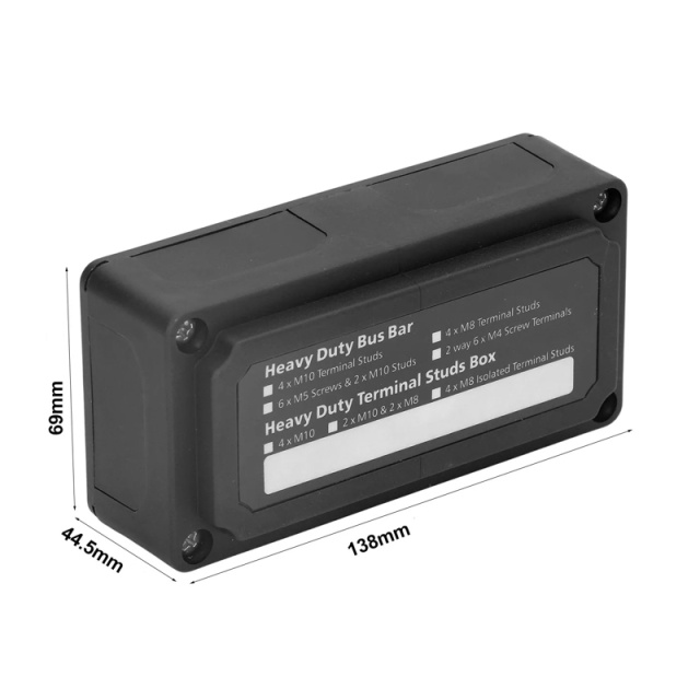 Розподільний блок Heavy Duty Bus Bar призначений для комутації низьковольтних кабелів постійного струму з напругою до 48 вольт, опресованих клемами з отворами під розмір болта М8 в єдину систему. Розподільний блок має масивну шину з нержавіючої сталі з чотирма шпильками M8, висотою 18 мм, що дозволяє з'єднати між собою до 8 клем (по 2 клеми на шпильку).