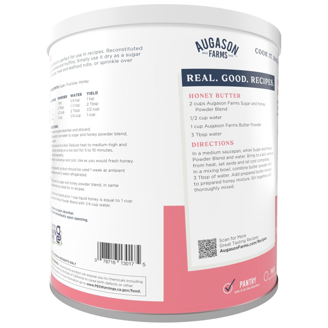Сублімований мед Augason Farms - це дегідрований мед у вигляді порошку, який після його відновлення (регідрації) стає звичайним медом, який практично не відрізняється від свіжого. Його можна використовувати так само, як і звичайний мед - додавати в чай замість цукру, намазувати на хліб або використовувати при приготуванні різних страв, додавати в вівсянку і так далі.