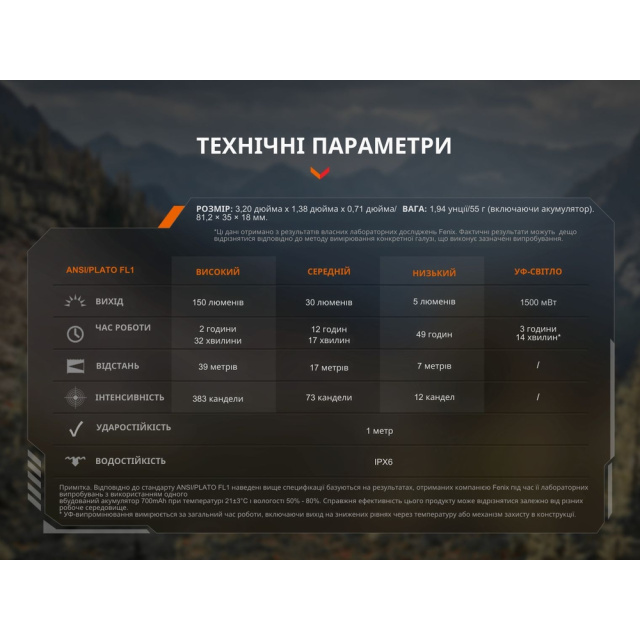 У Fenix SW05R-UV передбачено 4 режими, які розділені на 2 групи за типом освітлення.