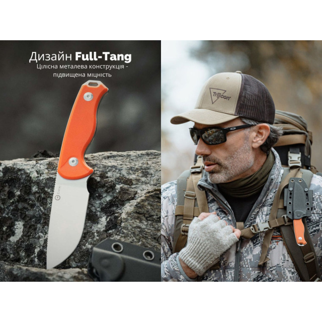 Форма клинка Drop Point з прямим заточуванням відрізняється універсальністю — ним однаково зручно різати та працювати на укол з матеріалами різної щільності. Клинок додатково оброблений методом галтування (stonewashed), яке прибирає металічний блиск, приховує дрібні подряпини та надає ножу естетично привабливого вигляду.