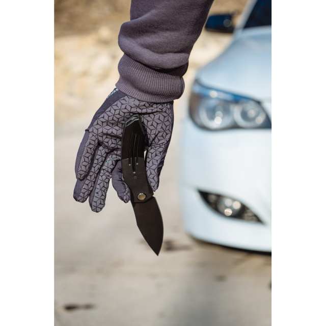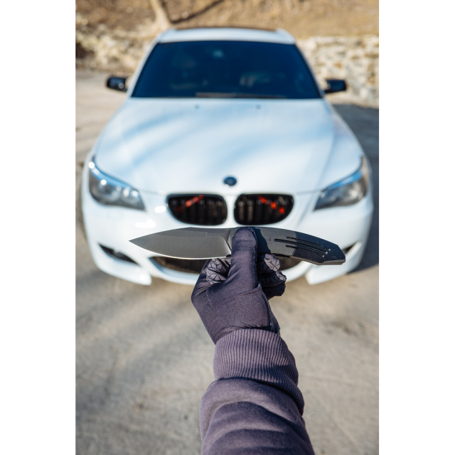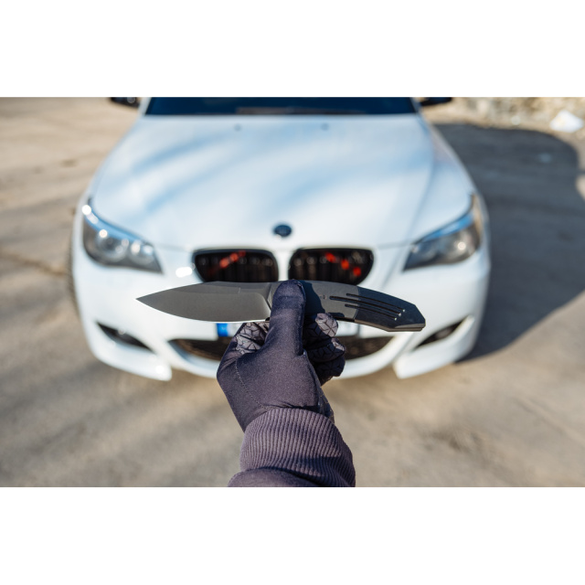 Руківʼя має чорне покриття в тон клинка та доповнене поздовжнім фрезеруванням з тонкими насічками на тильній стороні для підвищення надійності хвату. Конструкція лягає у долоню, як влита, зокрема завдяки довжині 123,4 мм, що дозволяє вільно розмістити всі пальці.
