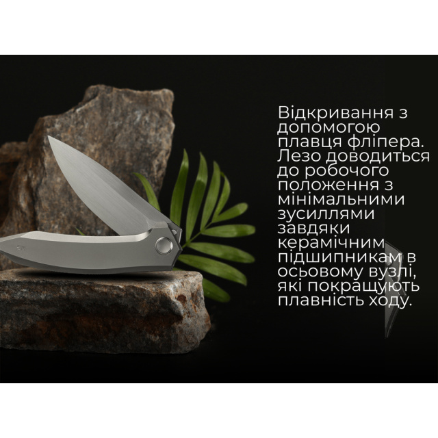 Відкриття ножа здійснюється натисканням на плавець фліпера для вказівного пальця та відбувається миттєво завдяки кульковим підшипникам з кераміки в осьовому вузлі. Керамічні кульки легші та твердіші за сталеві аналоги і забезпечують більш плавне та швидке відкриття клинка з мінімальним тертям та зношуванням. За фіксацію леза відповідає замок Frame Lock.