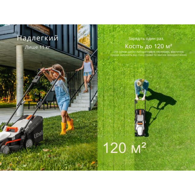 Газонокосарка Litheli забезпечує швидке скошування трави та бур'янів, гарантуючи якісний догляд за газоном у дворі вашого приватного будинку та парковою зоною. Модель підходить для обслуговування невеликого саду та відкритого простору площею до 120 м2 — саме стільки газонокосарка може обкосити на одному заряді акумулятора.