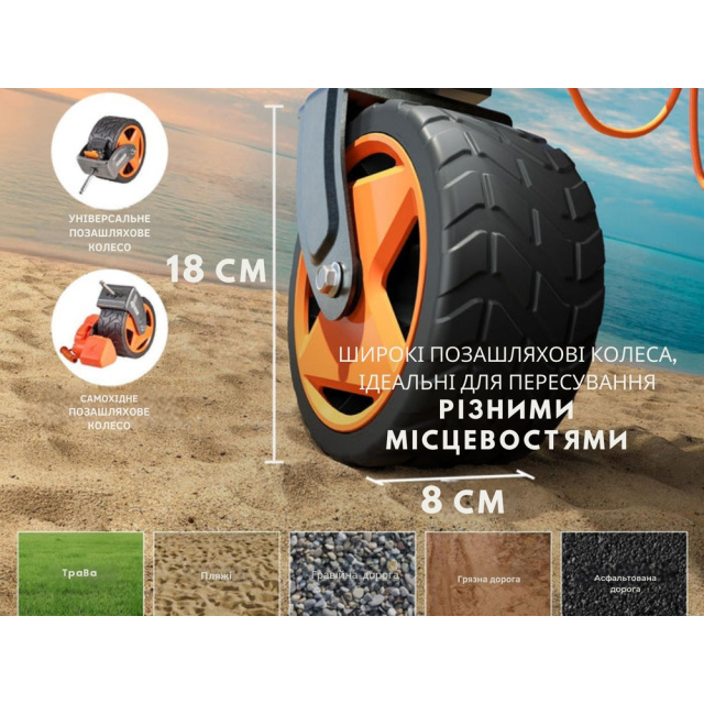 Візок оснащений ручкою з регульованим нахилом, який підлаштовується під зріст користувача для комфортного використання. Габарити моделі у встановленому положенні сягають 110 х 58 х 68 см / 103 см з урахуванням ручки.