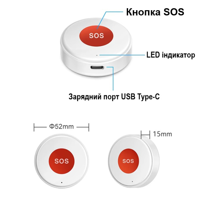Кнопка виклику має круглу форму корпусу та лише один елемент управління – кнопку виклику. Кнопка має вологозахисний корпус для гарантованої та тривалої роботи у різних умовах. Усередині знаходиться керуюча електроніка і акумулятор, що перезаряджається. Заряджання акумулятора відбувається через Type-c роз'єм.