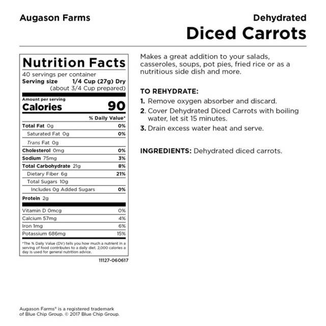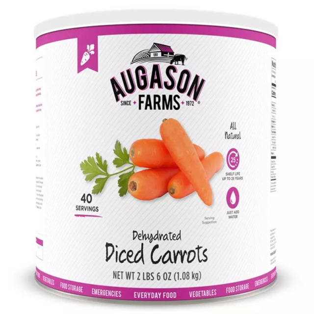 Сублімована нарізана кубиками морква Augason Farms - це дегідрована нарізана свіжа морква, з якої була видалена вся волога і її можна відразу використовувати в їжу після регідрації (відновлення). Її можна використовувати для заправки салатів або для смаження а також у багатьох інших стравах так само, як і свіжу моркву.