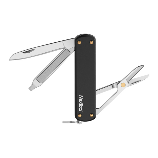 Мультитул оснащений складаними інструментами, що виконують 5 функцій: клинок з нержавіючої сталі 420J2 з прямим заточуванням, ножиці, напилок з плоскою викруткою на кінці, а також отвір для металевого кільця, щоб кріпити конструкцію на ключі, сумці або лямці рюкзака.