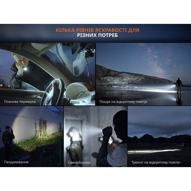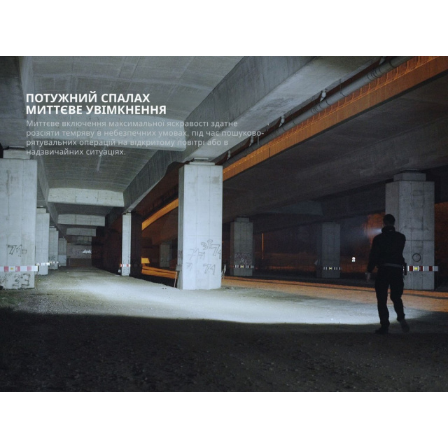 Зверніть увагу! Час роботи в режимі Спалах вказано в сумі з часом світіння на менш яскравих режимах. Ліхтар автоматично перемикається на меншу потужність, якщо спрацьовує захист від перегрівання.
