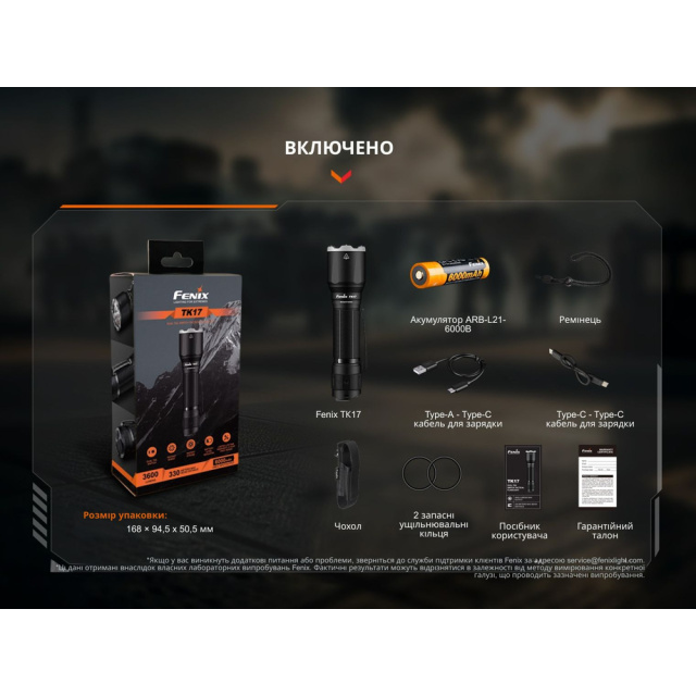 Ліхтар Fenix TK17, акумулятор ARB-L21-6000B, зарядний кабель Type-A / Type-C, зарядний кабель Type-C / Type-C, темляк, 2 запасні ущільнювальні кільця, чохол, інструкція користувача, гарантійний талон.