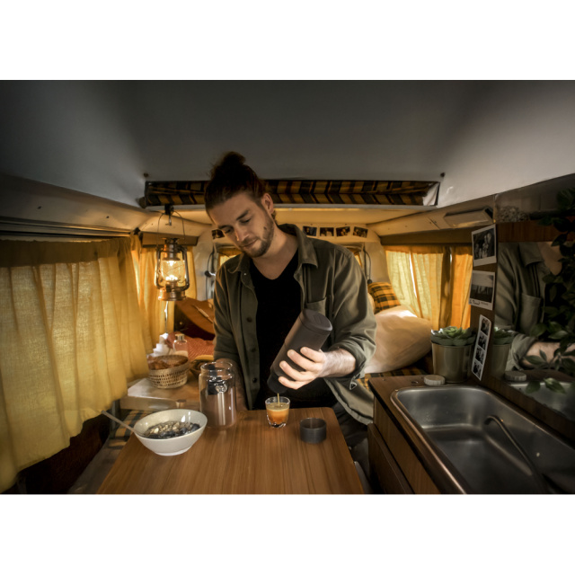 Корпус стійкий до водяних бризків, але його не можна повністю занурювати у воду або мити в посудомийній машині. З урахуванням компактності 74 х 74 х 181 мм та чохла в комплекті, Pixapresso поміщається у рюкзаку, сумці або бардачку автомобіля, щоб ви насолоджувалися улюбленими напоями у будь-якій точці світу.