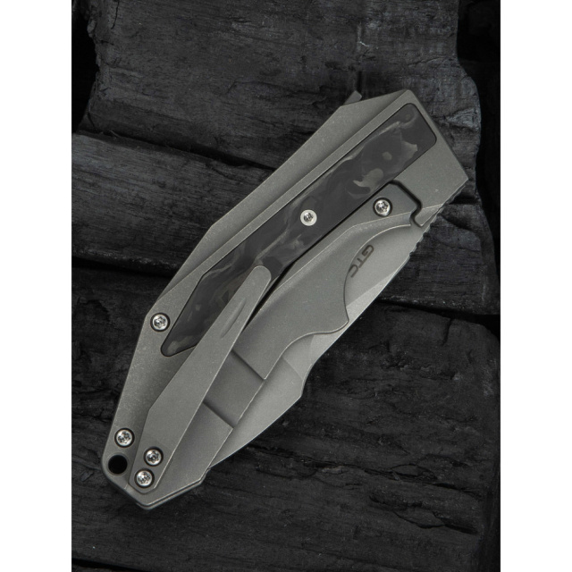 • Руківʼя з титану 6AL4V інкрустоване вставками з карбону, що імітують мармур. Сплав несприйнятливий до іржавіння та має надлегку вагу, знижуючи втому в запʼясті під час тривалого утримання інструменту. Вставки з вуглецевого волокна роблять зовнішній вигляд ножа по-справжньому люксовим.