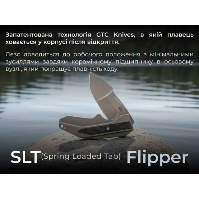 Для відкриття WeKnife Coral використовується унікальний механізм SLT (Spring Loaded Tab) Flipper — запатентована технологія GTC Knives, в якій плавець ховається у корпусі після відкриття. Осьовий вузол працює на керамічних підшипниках, що забезпечує бездоганно швидке відкривання без зайвих зусиль.