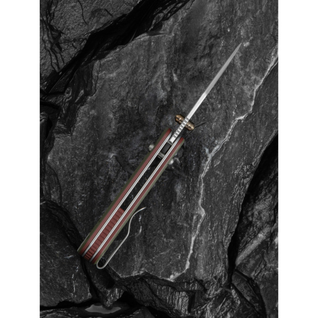 Двосторонній шпеник дозволяє миттєво відкрити ніж, що можна зробити правою або лівою рукою. Матеріал шпеника — титан 6AL4V золотого відтінку, який є оригінальною акцентною деталлю в загальному дизайні конструкції.