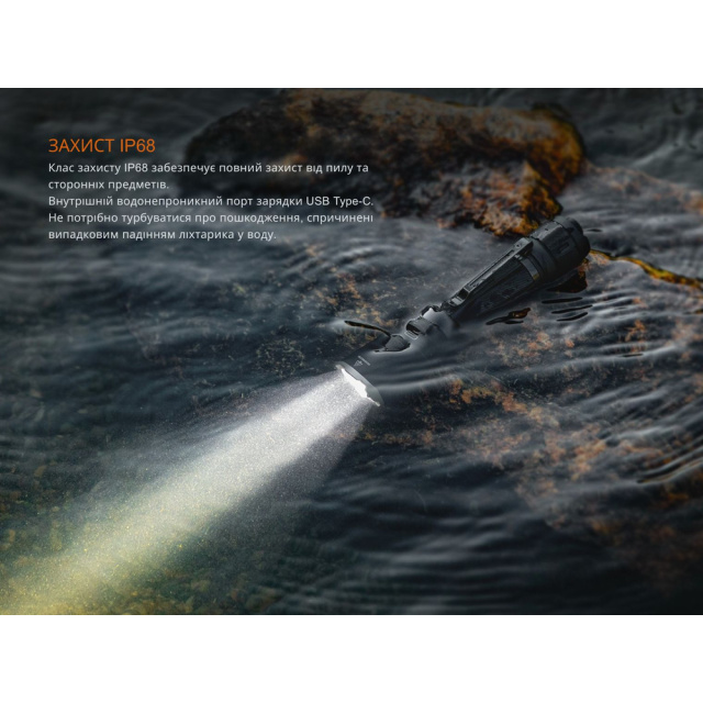 Конструкція має дрібну накатку для міцного утримання та доповнена знімною кліпсою. Стики ущільнені для максимальної герметичності IP68 — ліхтар продовжує працювати навіть після багаторазового занурення у воду.