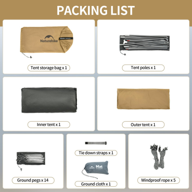 Намет постачається у фірмовому чохлі в комплекті з іншими дрібними аксесуарами, зокрема алюмінієвими кілочками та нейлоновими вітротяжками зі світловідбивними елементами.