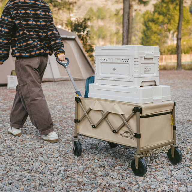Складаний візочок Naturehike CNK2350JJ012 спрощує транспортування речей на природі, дачі та в супермаркеті. Містка конструкція об'ємом близько 110 л вміщує спорядження для всієї компанії — від великого намету та складаних меблів до харчових продуктів і кухонного приладдя.