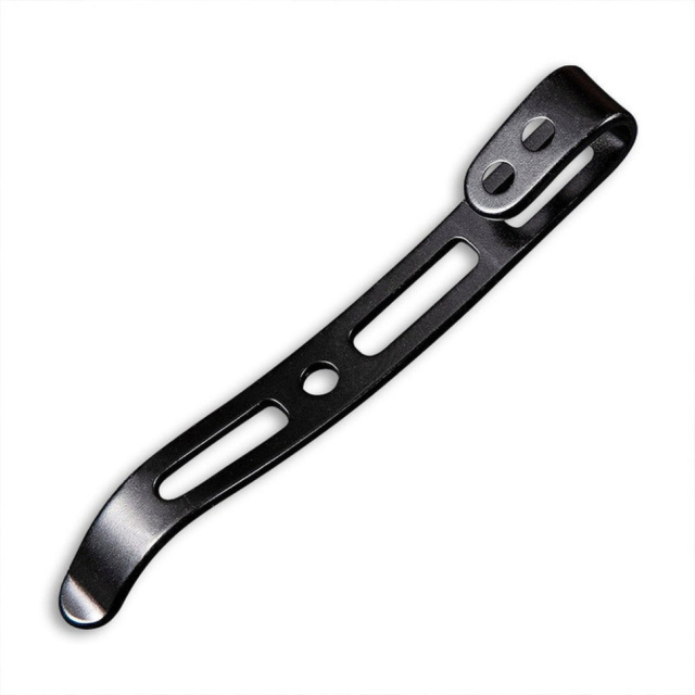 Матеріал — нержавіюча сталь, стійка до зношування та корозії. Довжина затискача сягає 5.8 см, а його дизайн перешкоджає чіплянню за рукави одягу у разі кріплення ножа на поясі або кишені штанів.