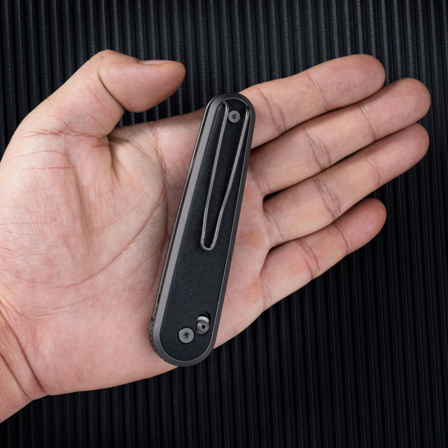 Сталева кліпса Tip-Up з правого боку руківʼя орієнтована на носіння інструмента вістрям вверх і дає можливість непомітно сховати ніж у кишені.